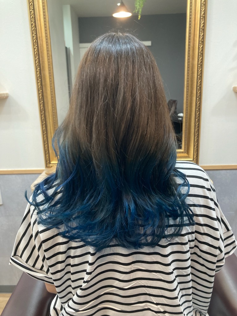 毛先をブルーにしたいとのことで、全体的にはトーンダウン