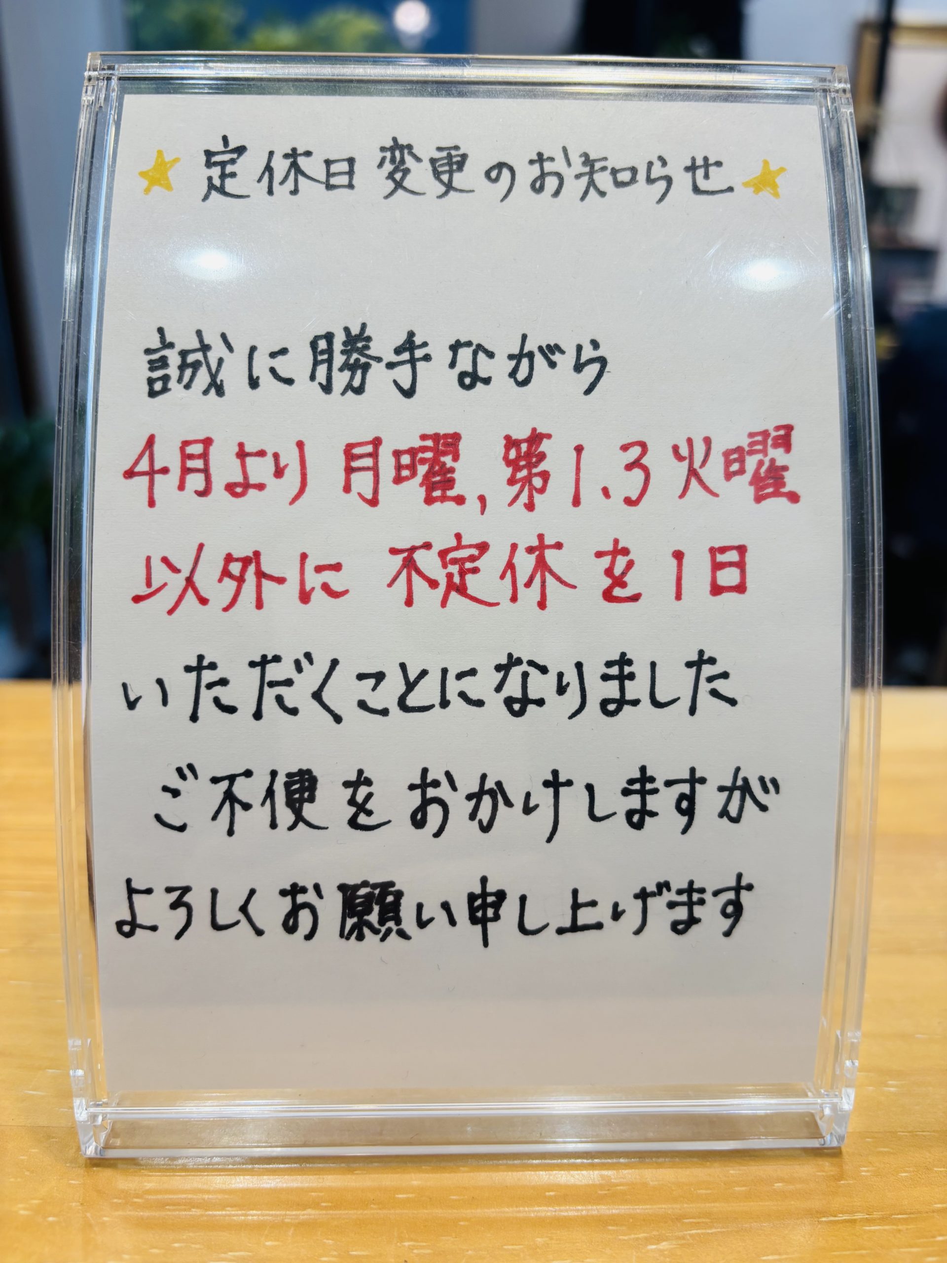 誠に勝手ながら4月より定休日以外に不定休を一日