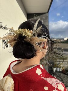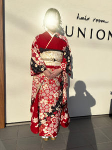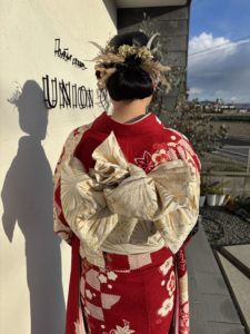 赤い着物で、帯に白をもってくるのが今年っぽくて
