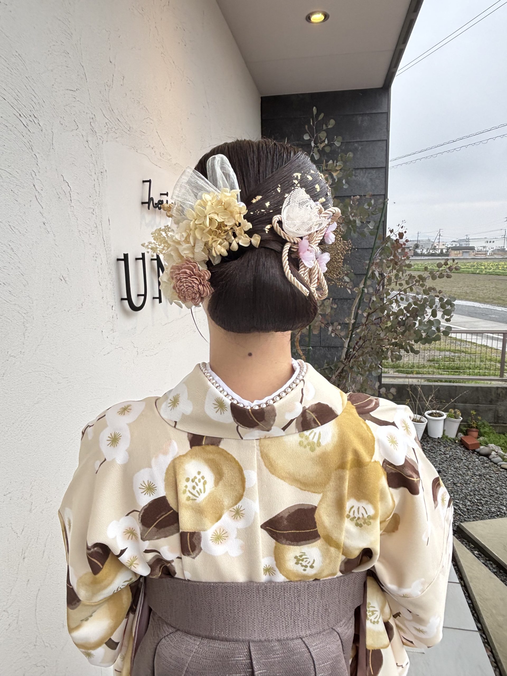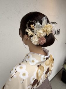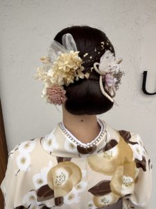 ので、タイトシニヨンに飾りをつけて金箔でまとめる