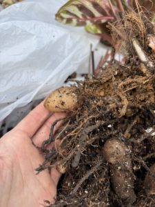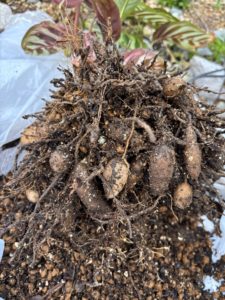 カラテアの根っこに芋がたくさんぶら下がっていて