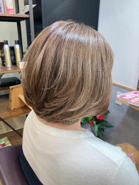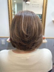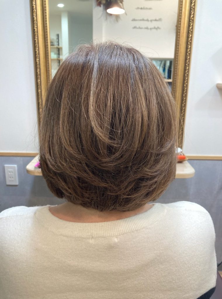 - 毛量が少ない方、ボリュームアップさせたい方は、ゆるくてもパーマをかけてあげるのが効果大。カラーはグレーカラー2.0でダメージ弱でハイライト&ローライトのメリハリカラーも可能に。60代ヘアもこんなにスタイリッシュ+エレガントになります。