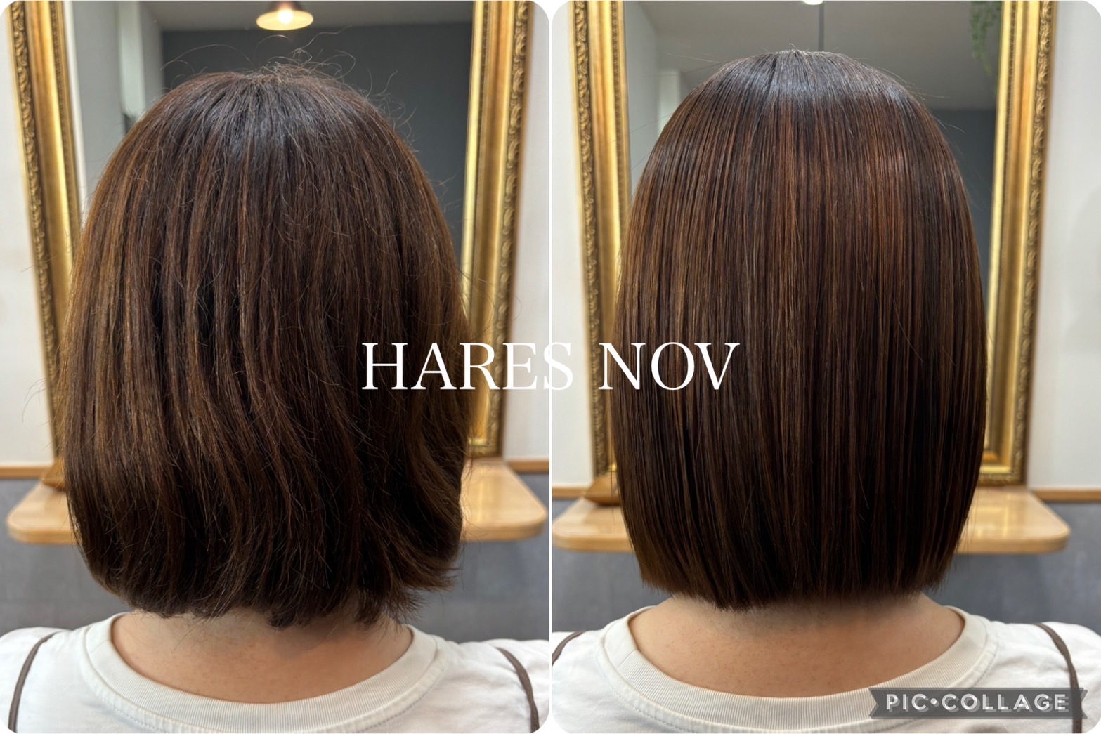 髪質改善ハリスノフ グリオキシル酸を使った酸性の髪質改善トリートメントです。毛髪内の癖の原因となる細胞の歪みを補修して整えます。髪のハリ感、艶感が欲しい方。エイジングヘアにお悩みの方にオススメです。